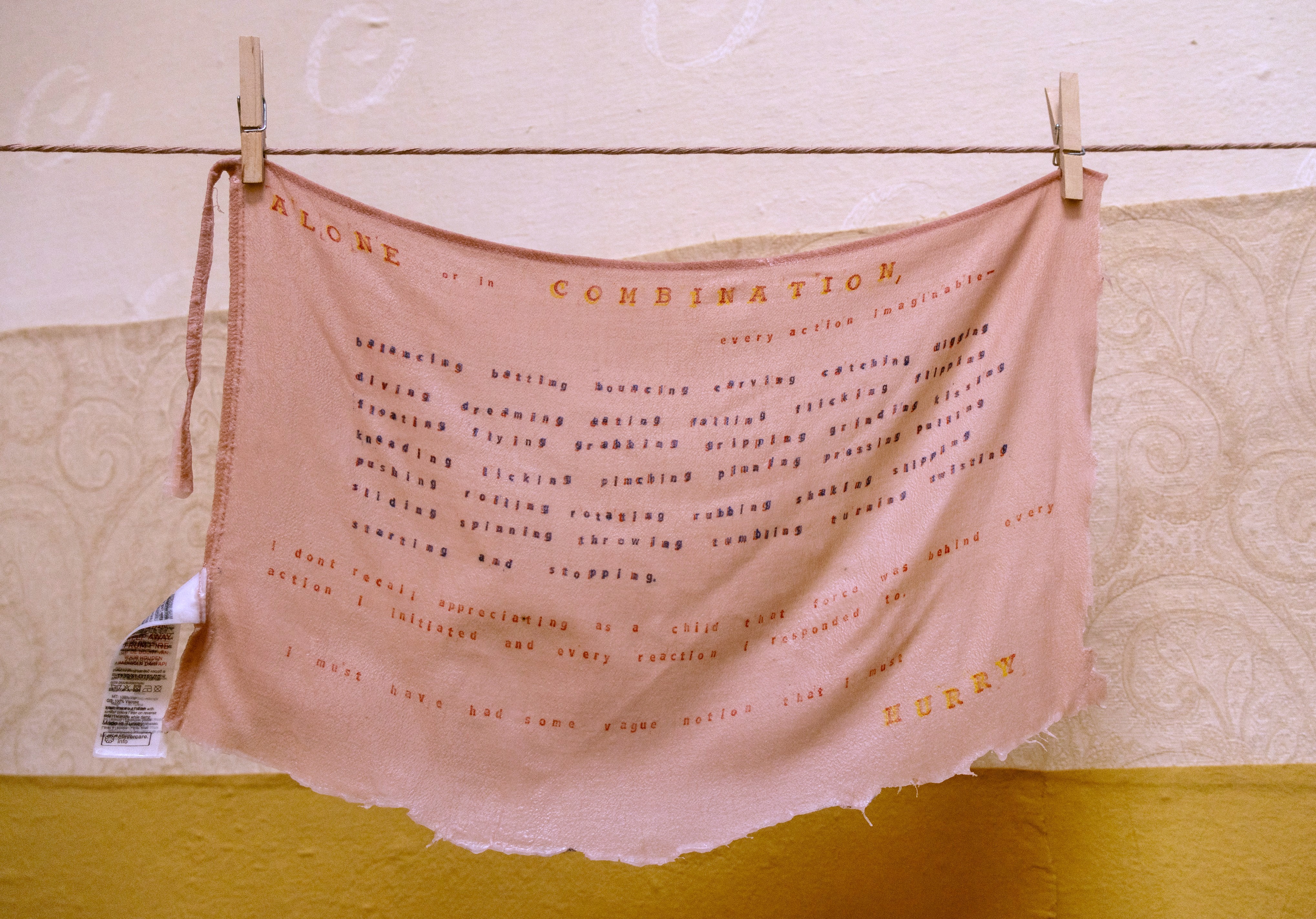 2024. Torn dress, wax, hand-stamped text.
