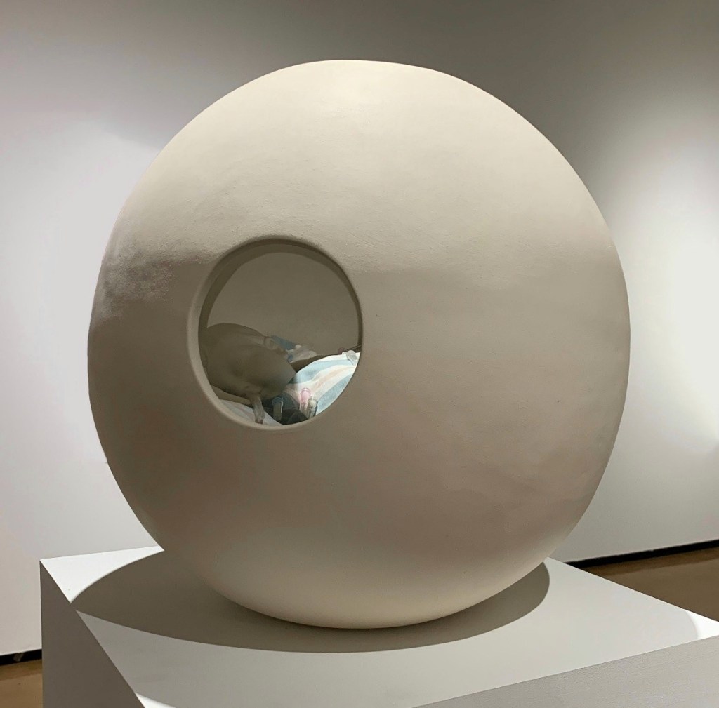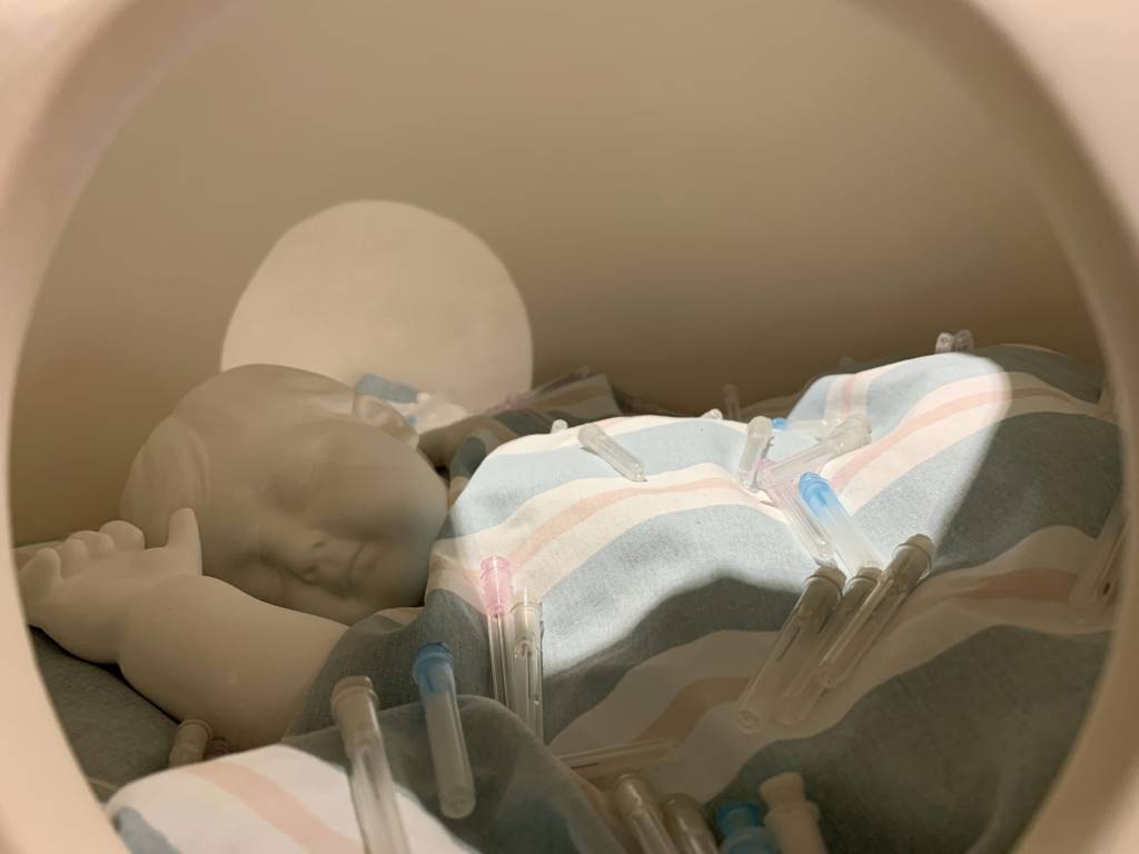 2022. Porcelain, stoneware, blanket, 41 used hormone replacement therapy needles from the artist.