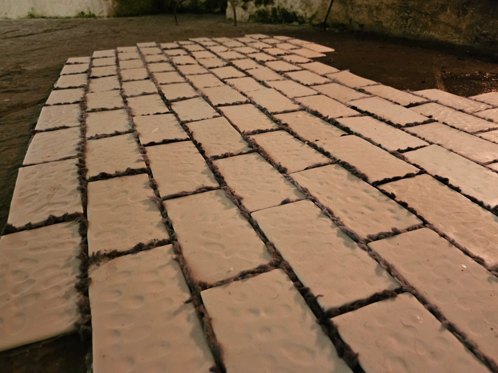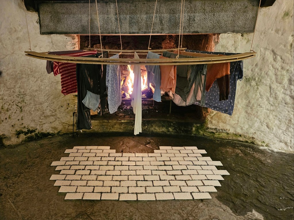 2024. Laundry, scented wax, testosterone gel packets, drying rack, handmade porcelain tiles, dryer lint.
